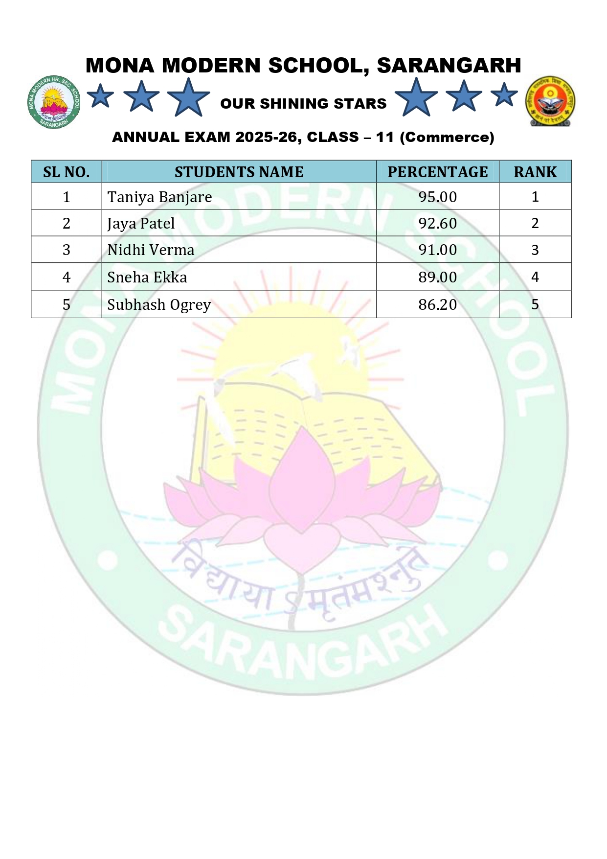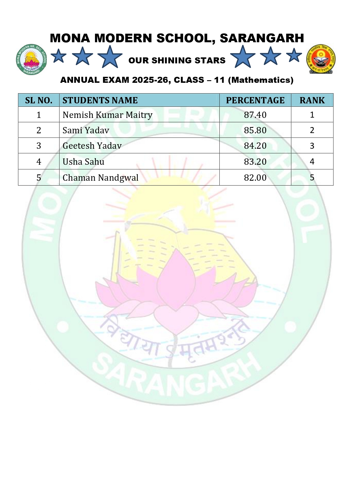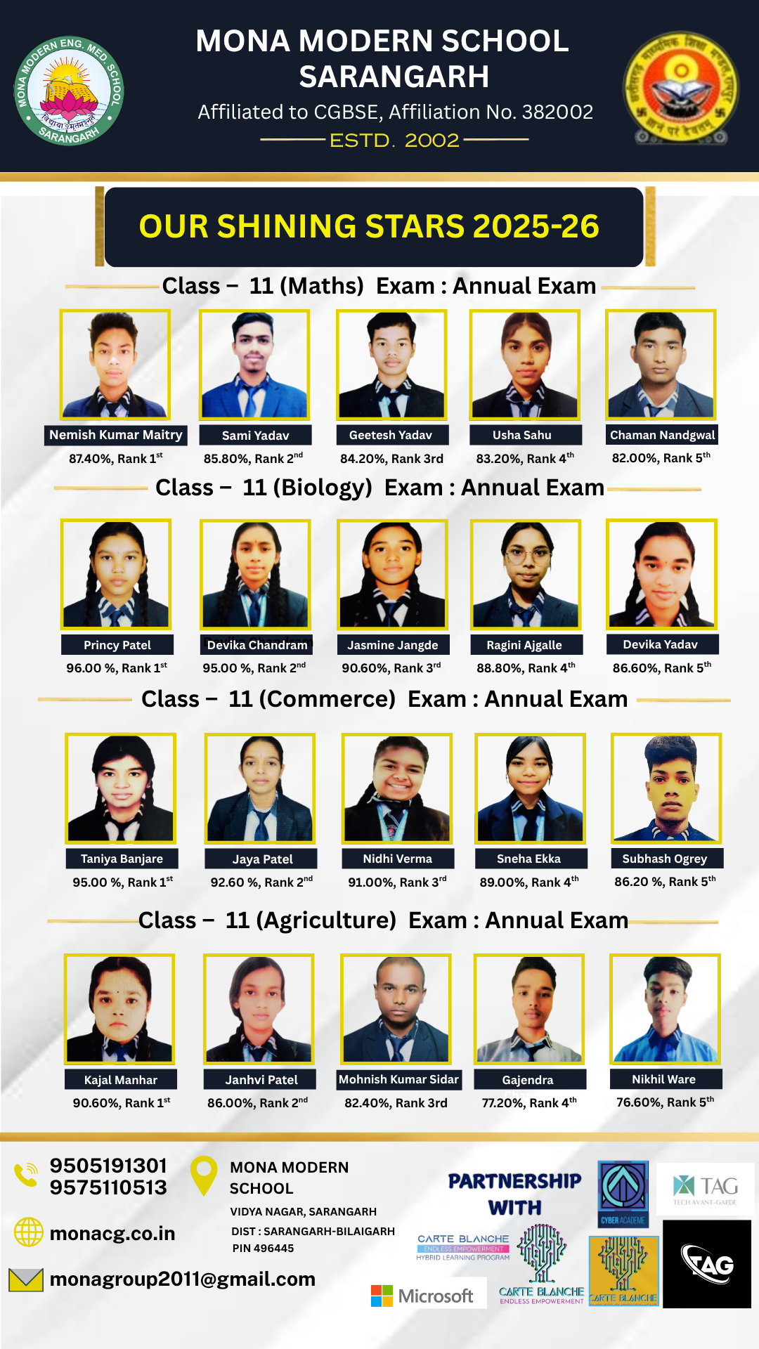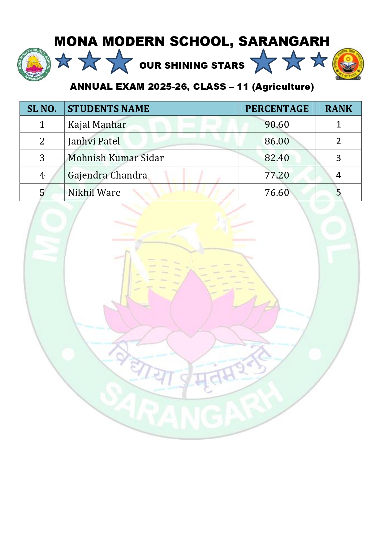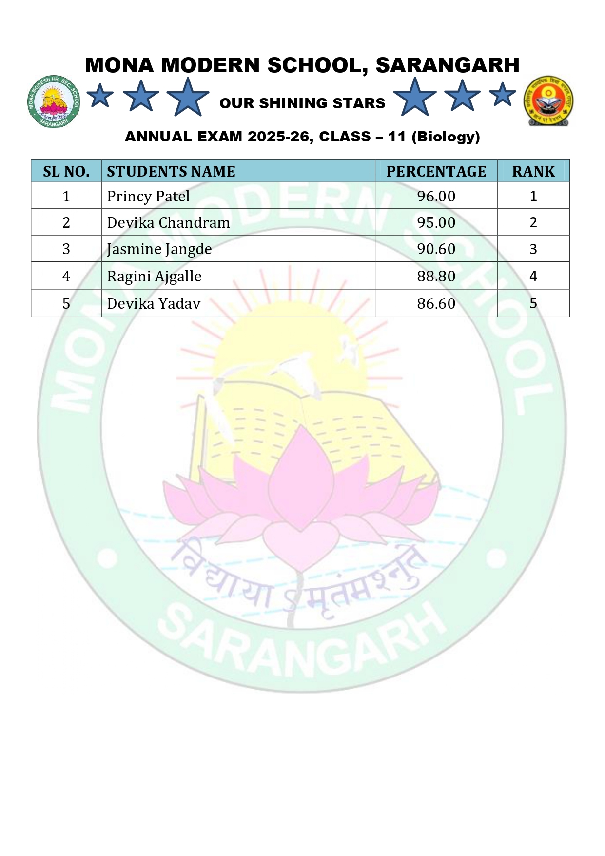 Annual Exam 2025-26 Toppers Class – 11 Section – Mathematics Section – Biology Section – Agriculture Section – Commerce